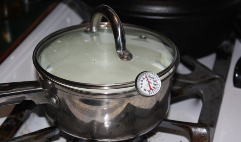 Now put the lid on your jar and put the jar in a little lunchbox-size cooler and fill the cooler with the hottest tap water you have up to the neck of the jar. Loosen the lid just a bit and close the lunchbox. Set it somewhere it won’t be bothered or opened.